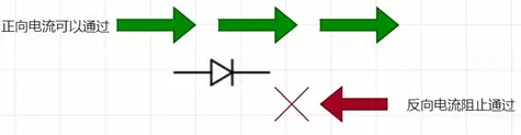 二极管导电图 | 图源: 百度百科 交流电转化为直流电:根据二极管的单向导电性,可用4个二极管组合成整流桥,整流桥就可以将交流电转为直流电。
