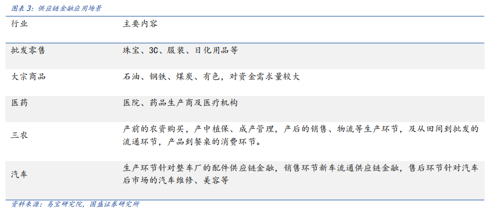 供应链金融的应用场景遍及各个产业,应用空间广阔。供应链金融可以为小微企业提供更灵活、更简便的贷款服务,行业涉及批发零售、大宗商品、医药、三农、汽车等。