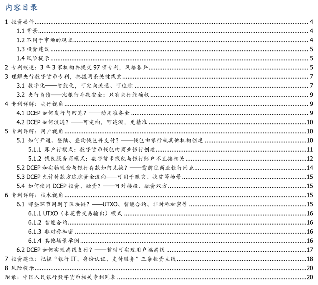 DCEP在交易安全、应用开发等方面的机会不容忽视。市场认为,DCEP产业链的投资机会只在身份认证、支付服务等领域。我们认为,交易安全、应用开发等方面的机会同样不容忽视。例如,由于DCEP比商业银行存款安全性更高,但面值相同,坊间可能形成有关DCEP的场外市场,这一风险值得重视。另外,根据央行数字货币研究所所长姚前等领导的论述和央行有关专利,DCEP或将参与撮合投融资或其他应用场景,厂商需高度关注此类机会。