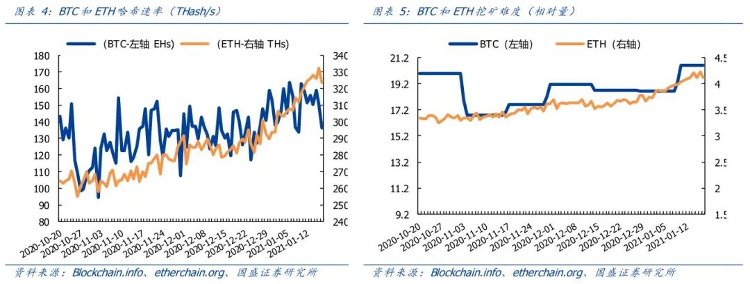 上周BTC全网挖矿难度为20.61T,环比上升8.5%;下次难度调整日在2021年1月23日,预计难度值为21.91 T(+6.32%);上周ETH全网平均挖矿难度为4.13T,环比上升5.0%。