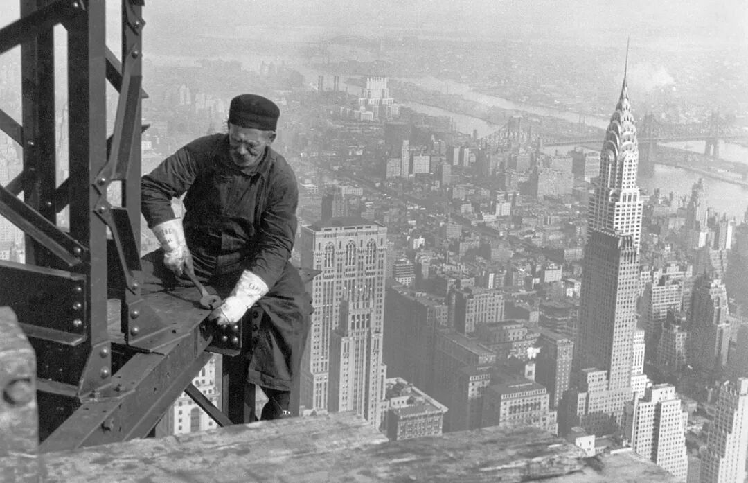 △ 工人在建造帝国大厦,远处为克莱斯勒大楼 图源:wiki