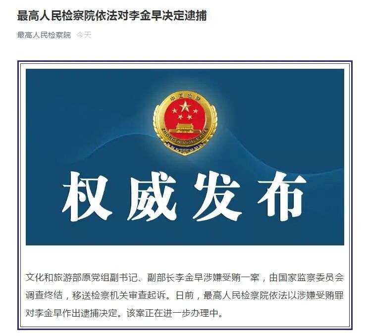 文化和旅游部原党组副书记、副部长李金早涉嫌受贿一案,由国家监察委员会调查终结,移送检察机关审查起诉。日前,最高人民检察院依法以涉嫌受贿罪对李金早作出逮捕决定。该案正在进一步办理中。
