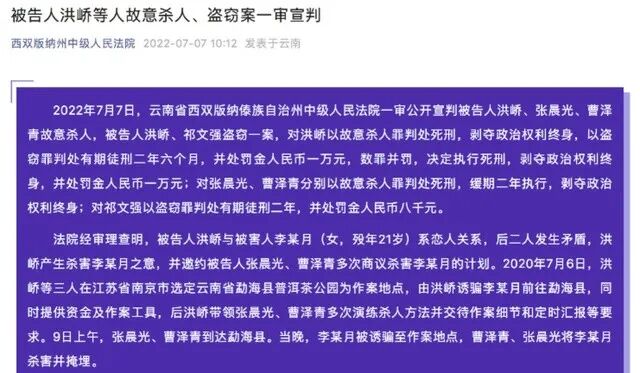 2022年7月7日,该案在云南西双版纳州中级人民法院一审宣判:洪峤因故意杀人罪被判死刑,张晨光、曹泽青因故意杀人罪被判死缓。