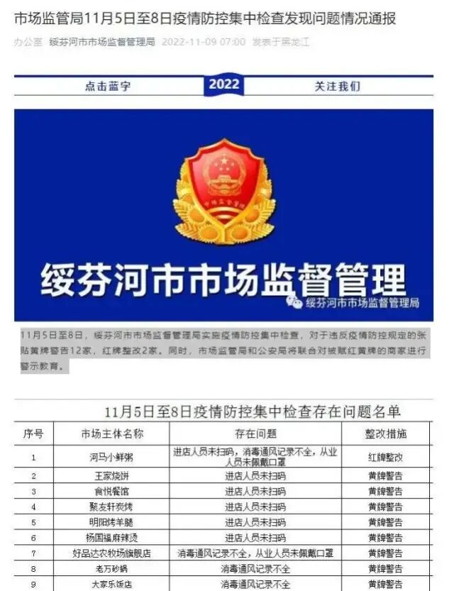 据同属于牡丹江市管辖的绥芬河市市场监督管理局11月9日在官方微信公众号,11月5日至8日,绥芬河市市场监督管理局实施疫情防控集中检查,对于违反疫情防控规定的张贴黄牌警告12家,红牌整改2家。同时,市场监管局和公安局将联合对被赋红黄牌的商家进行警示教育。