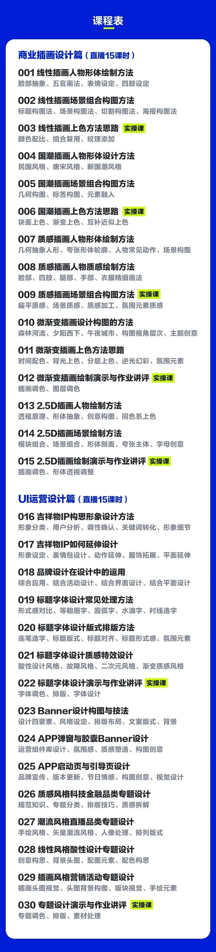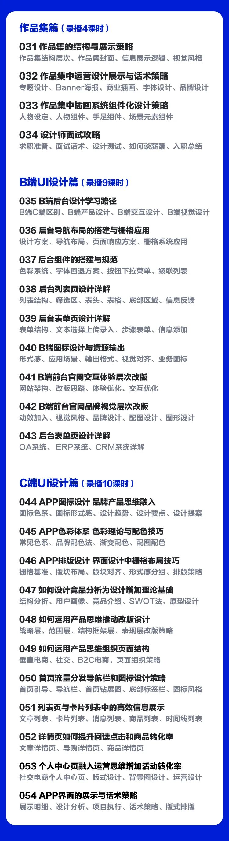 课程全程只有我一个人来授课,没有助教。这样的好处就是你一直面对的就是我,我非常熟悉你,你也熟悉我,另外就是课程知识涵盖范围广,我可以解答你各种设计问题,同时提供更多的个性化指导。课程分为四大块,一共53节,每节课90到120分钟。课程包含30节直播课和23节录播课。第一部分为30课时的视觉设计课(直播),包含当下非常重要的商业插画设计、运营设计和品牌IP设计,主要是打好扎实的设计执行基础。第二部分为4课时的作品集(录播)课,可以在后期做作品集时反复找我指导修改。第三部分为9课时的B端后台设计(录播)课,第四部分10课时的C端APP设计(录播)课。