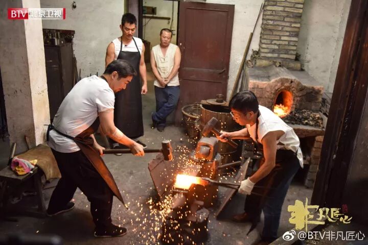 2017年10月中旬,浙江龙泉市陈记阿金剑铺,第二季《非凡匠心》录制现场,这一天的工作从早晨9点钟开始,前店后厂楼上是住家的大院子里塞满了工作人员和机器设备,一切有条不紊地进行中。嘉宾张国立和任贤齐正在匠人师傅陈阿金和大徒弟的指导下一锤一锤地锻造着一把属于他们自己的宝剑,铁锤落在刀片上,火花四溅,赤膀的男人们如武侠书页中的好汉一般,汗珠挂在脖子上,烧铁的炉光照得他们脸上红通通的。