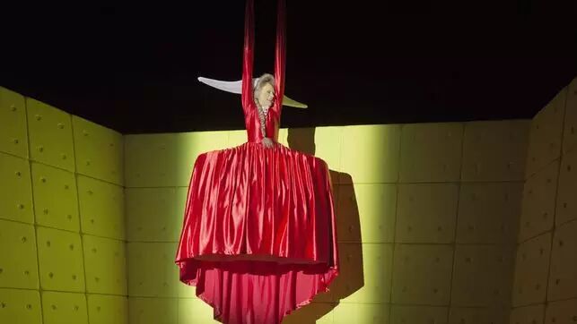 △舞台上的“精神病院房间”由类似橡胶质地的软垫支撑搭建而成,随着灯光的变化,三壁呈现柠檬黄、荧光绿等多种明艳的色彩,并时常与演员身上的灯光颜色形成鲜明对比。演员肢体表现相当抢眼,是人物心灵与精神状态的外化
