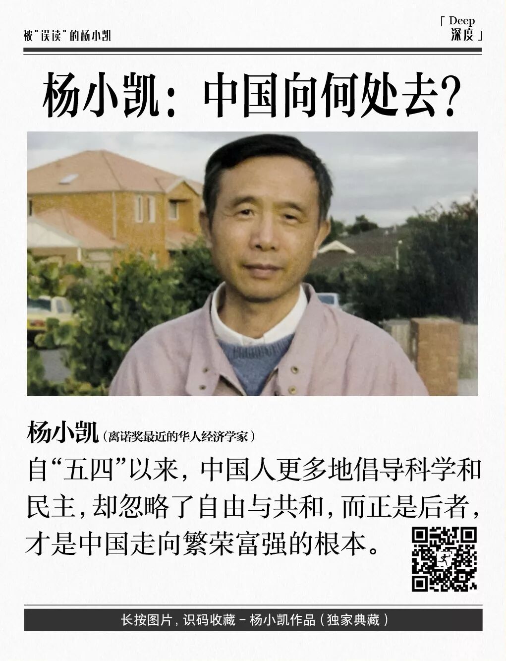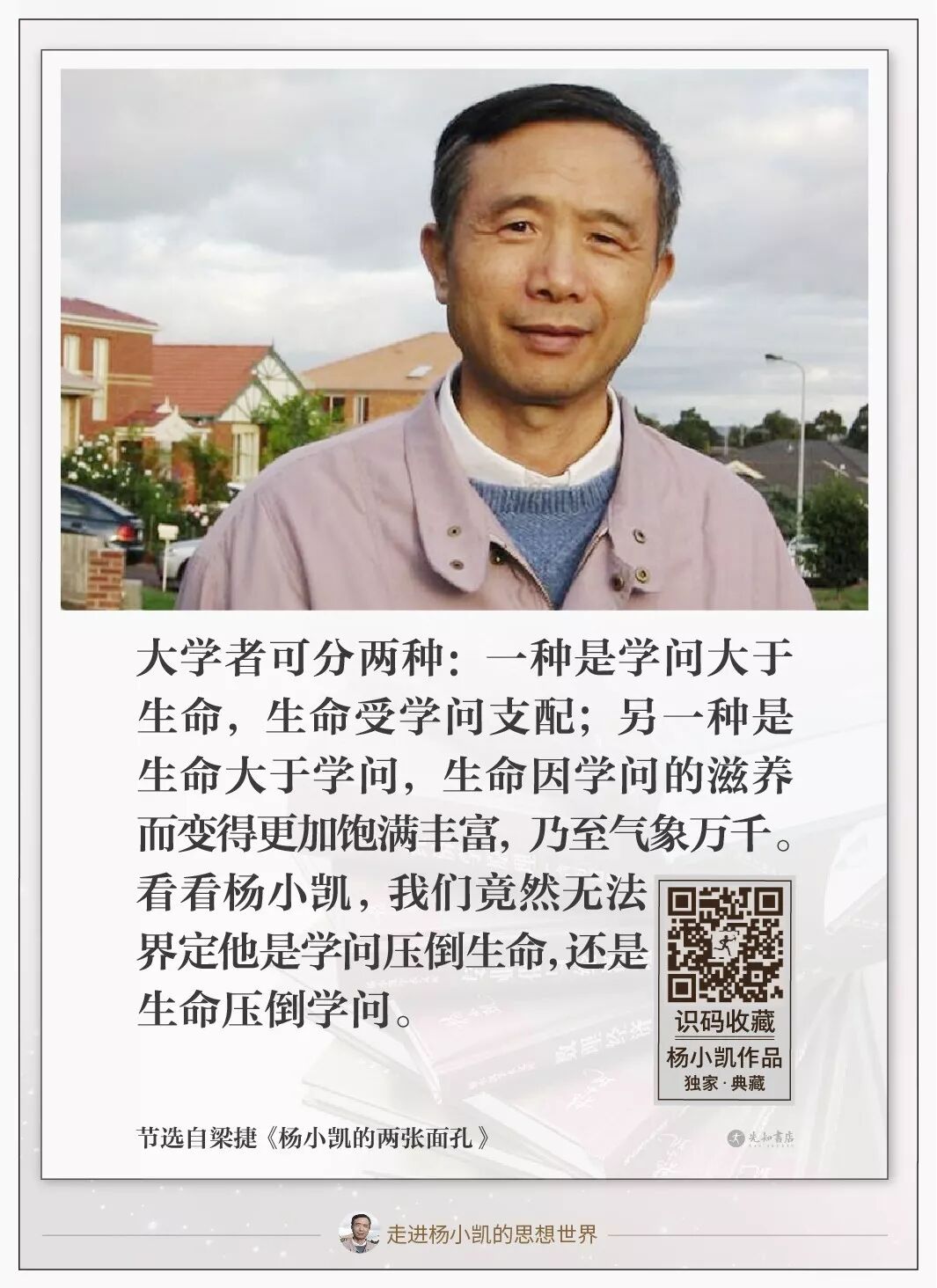 为何会出现 “杨小凯现象”?熟悉杨小凯的人,通常会总结为三条:· 传奇的人生经历:18岁那年,杨小凯因一篇“中国向何处去”被捕入狱,但他却将牢狱变成了“大学”,自学成才。出狱后,几经波折赴美深造,终成首位开宗立派的华人经济学家。· 三大原创性贡献:杨小凯在短短26年学术生涯内完成“三次范式革命”:“新兴古典经济学”的开宗立派,以及“后发劣势”“信仰是制度的第一因”的洞见。前者让他成为最接近诺奖的华人经济学家,后两者正在成为先知般的预言。· 独具魅力的人格:杨小凯出身高干家庭,却关心底层疾苦,尤其反感把人分为三六九等的制度与文化;他桀骜不驯,待人却谦卑随和;谈及学术他口若悬河,但在言及自己时,却不善言辞;与人合作研究,合作者最后发现主要贡献均属于杨小凯,但他却坚持自己的名字应该署在后面,无论合作者是大学者,还是他那些名不见经传的学生......