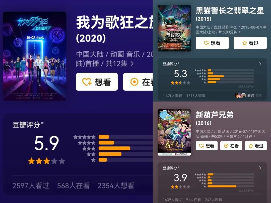 2020年上美影时隔20年上线了《我为歌狂》的第二季,不过目前播放量不足2000万次,豆瓣评分也仅有5.9。2017年和2021年上映的“大耳朵图图”IP动画电影票房也仅在5000万元上下,评分均在及格线边缘。