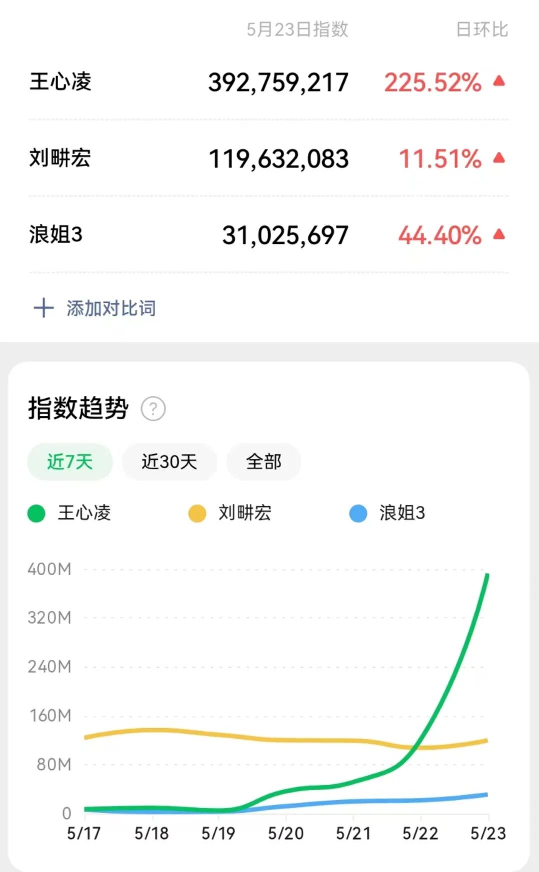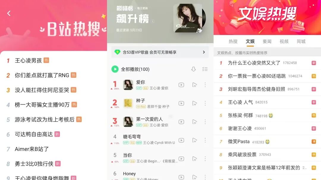5月23日当天,王心凌同时登顶微博、抖音、B站等各大平台热搜,其经典歌曲则霸占QQ音乐、网易云音乐的多个榜单。根据微信指数显示,5月23日“王心凌”关键词的当日指数达392,759,217,暴增225.52%,是“浪姐3”的十多倍。