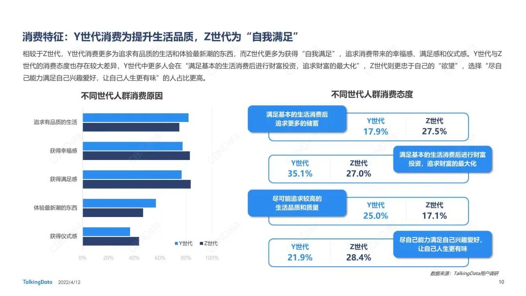 不仅如此,随着这一代人的成长,他们的消费能力也大幅提升,加之成长于国家经济快速发展、信息技术不断成熟的时空背景下,其消费观念也与上一代人有明显不同。根据TalkingData发布的《2021新消费人群报告》显示,我国Y世代(出生于1980-1994年)人口达3.25亿,Z世代(出生于1995-2009年)人群则有2.33亿,两大世代人群的年消费规模分别是6.68万亿和4.94万亿,是当前消费市场的绝对主力军和有力增长点,尤其是其中的Z世代其消费观念更强调“娱乐至上”和“自我满足”,并在游戏、听歌、看剧等娱乐内容和潮鞋、手办、汉服等爱好消费领域的消费欲望更高。