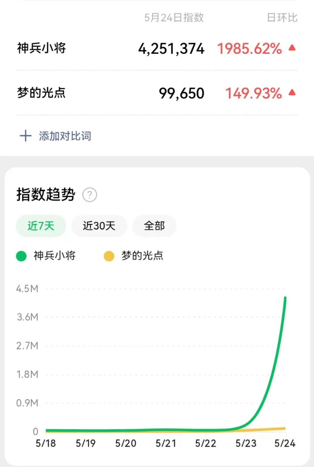 例如,由王心凌演唱主题曲《梦的光点》的国产动画《神兵小将》就引起了不少网友的讨论和回忆,其5月24日微信搜索指数环比暴增1985.62%至4,251,374。