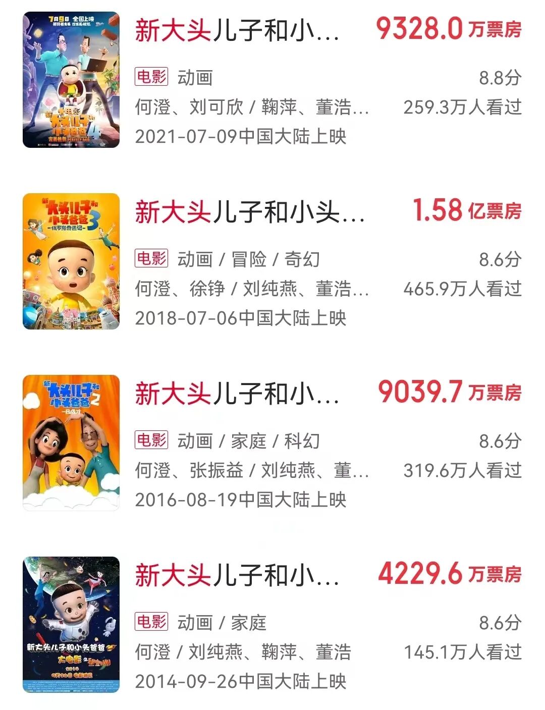 央视动漫最早在1995年的动画作品《大头儿子和小头爸爸》则在2013年推出了翻拍版的《新大头儿子和小头爸爸》在央视热播,并在14-21年接连推出4部动画电影,累计票房高达3.84亿元,是央视动漫集团出品的最为成功的系列动画电影作品。