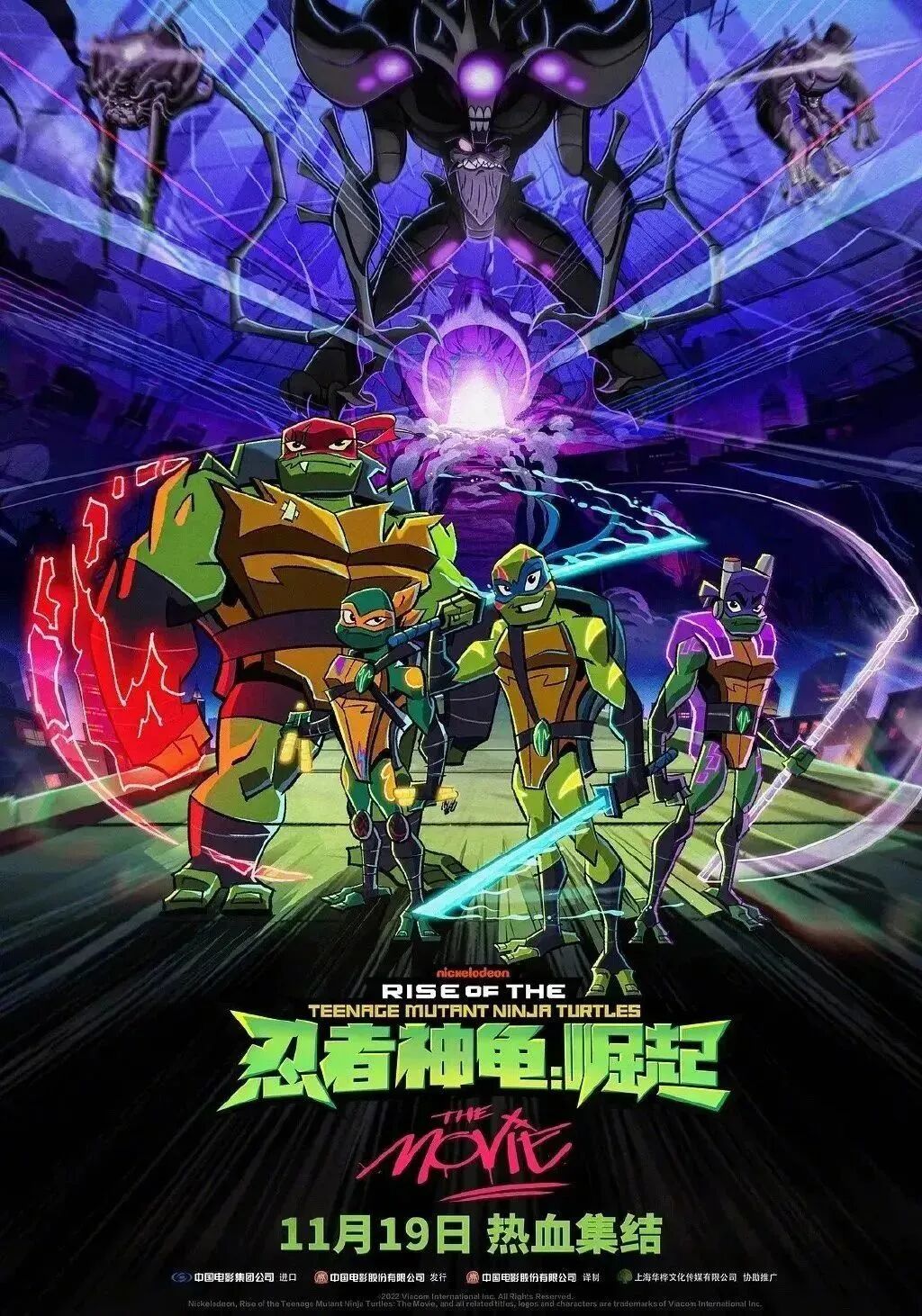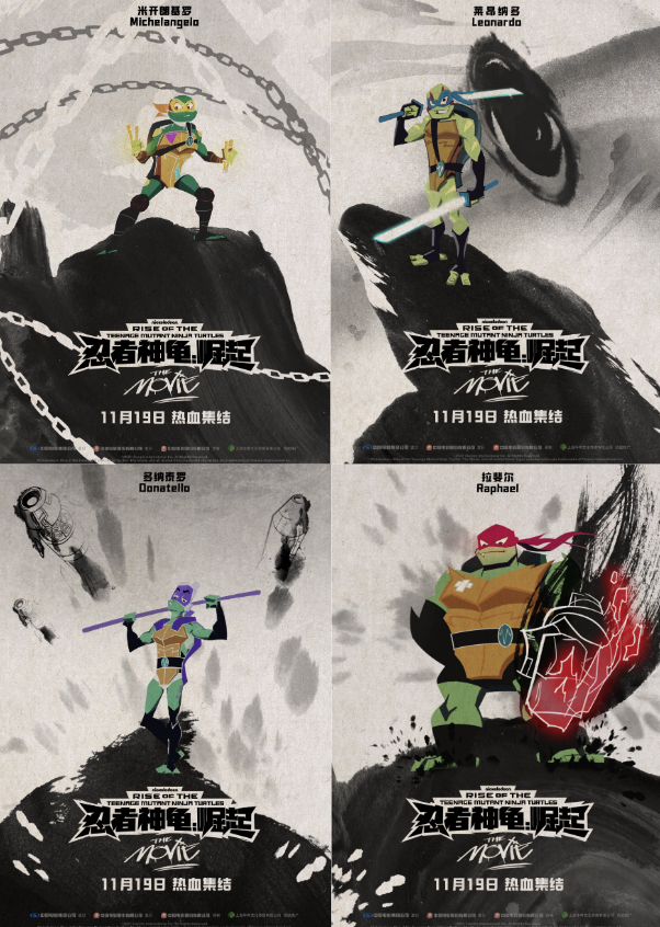 定档于11月19日的二维动画电影《忍者神龟:崛起》,讲述2044年的纽约,大反派朗格勾结外星恶势力试图毁灭地球,忍者神龟们决定回到过去时空,找到开启传送门的钥匙,阻止朗格,恢复世界和平。忍者神龟莱昂纳多、米开朗基罗、拉斐尔和多纳泰罗集体亮相,还有神龟的老师斯普林特、神龟的盟友艾普奥尼尔以及新角色凯西·琼斯一同团聚在“披萨之月”下。