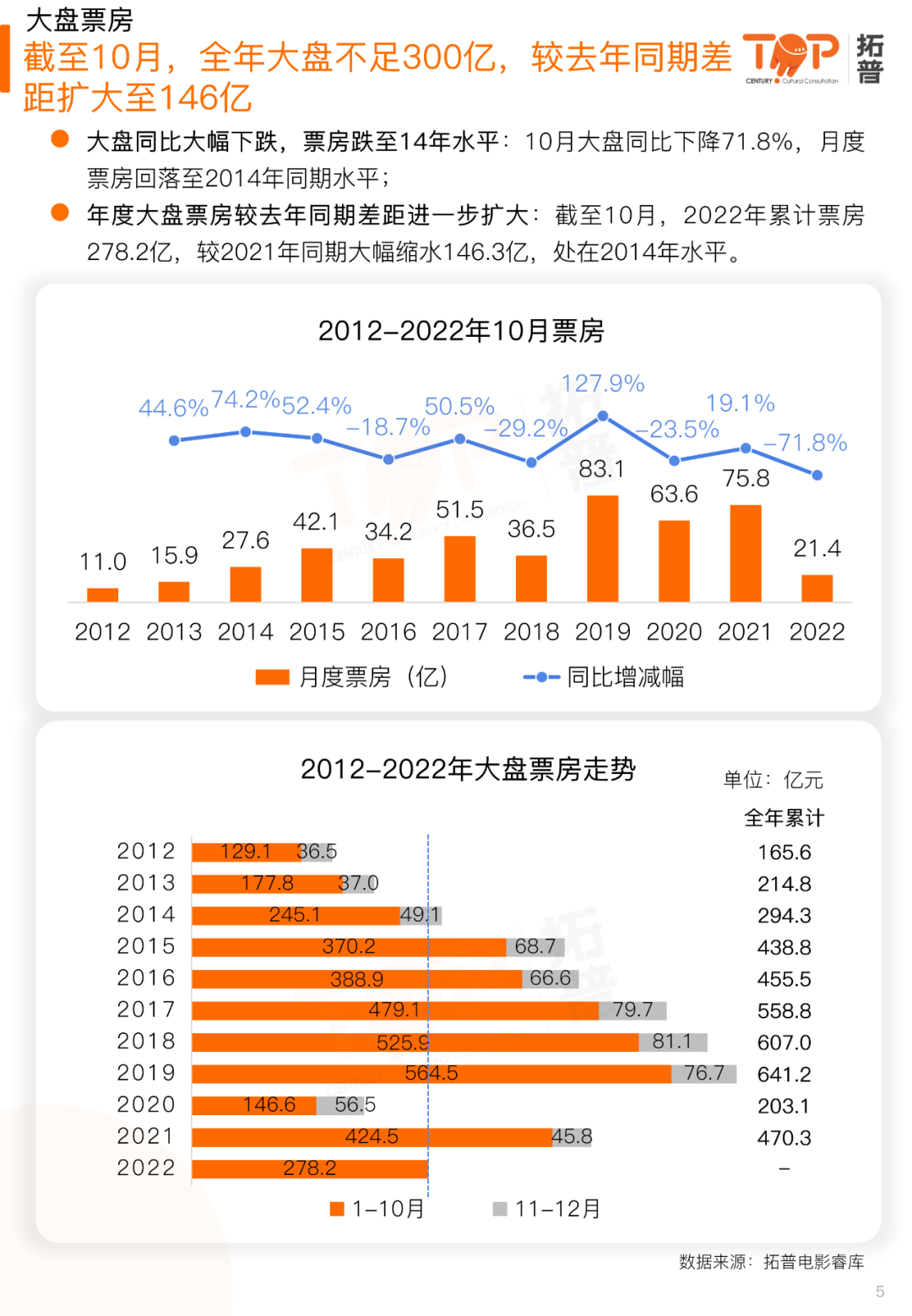 截止至今年10月份,全月累计票房将停留在21.4亿左右,可能大家对这个数字还没概念,这个票房成绩已经低于2014年的成绩,意味着市场直接倒退了近10年之久。