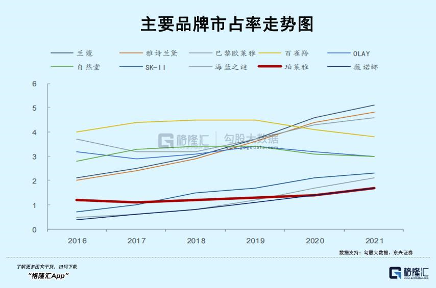 未来,公司还有较大的量上逻辑。第一,现在国内消费者越来越喜欢国货品牌,各行各业都在发生国产替代的逻辑,包括汽车、鞋服、香化等。第二,化妆品行业还有增量蛋糕,珀莱雅的市占率也在不断提升。据东兴证券,珀莱雅市占率从2017年的1.1%提升至2021年的1.7%。在TOP10中,珀莱雅和薇诺娜是国产唯二品牌。