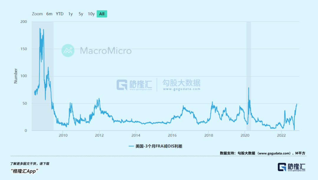 在美联储本次实质性加息以及12月即将到来的加息之后,这些雷曼式的黑天鹅将会有更大的可能被引爆。目前,FRA(远期合约利率掉期,参考3月期LIBOR)-OIS利差已经飙升至48.7点,创下2020年3月爆发系统性风险前的水平。该指标代表出借资金无法归还的违约风险,息差扩大暗示银行不愿出借资金,被视为全球银行体系信贷压力上升的表现。其中不仅反映了交易对手的信用风险,也隐含了市场流动性风险。随着美联储进一步提高利率,金融系统发生“美元荒”的概率会继续增加。