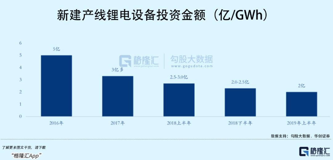 其次,近几年锂电池产线设备价格的下降,也令到整个行业准入门槛有了一些降低,规模效应叠加设备零部件国产化导致锂电设备成本大幅下降,目前国内锂电池产线单GWh产能投资价格已从原来的10亿元左右降至2.4亿元以下,降幅非常明显。