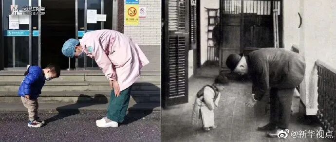 这张单纯而美好照片迅速刷爆了柯桥人的朋友圈。大家被小男孩圈粉,也被护士打动。还有人翻出了一张百年老照片:时任浙医二院前身广济医院院长的英国人梅滕更医师查房时,一位小患者彬彬有礼地向梅医师鞠躬,深谙中国礼数的梅医师也深深鞠躬回礼。