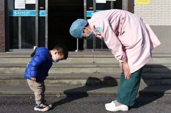 曹玲玲是绍兴市中心医院的一名护士长,她的感动来自于一个2岁的“小病号”。也就是在2月22日,小男孩病愈出院,曹玲玲按惯例送病人出门,刚打算挥手告别,小男孩向她突然鞠了一躬,曹玲玲立马还礼。而这一刻,凑巧被一旁的其他医护人员给拍了下来。