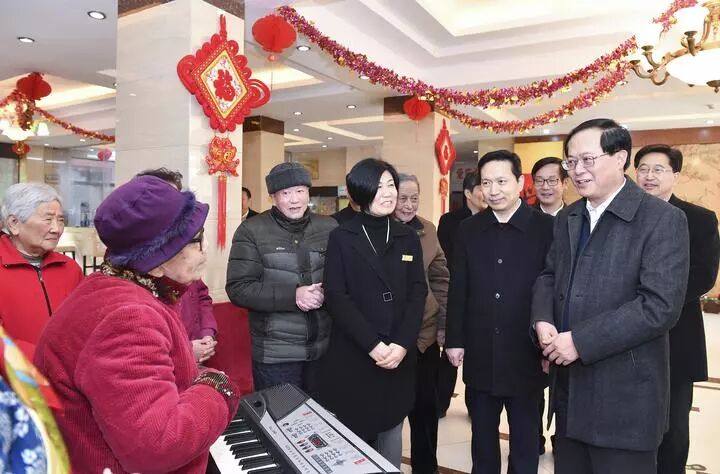 2月11日,省委书记车俊赴杭州江干区杭州爱康温馨家园,看望排练新春联欢节目的老人。浙江新闻客户端记者 梁臻 摄