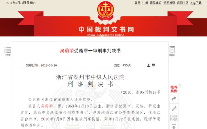 中国裁判文书网近日公布台州市委原书记吴蔚荣受贿罪一审刑事判决书,案号为(2016)浙05刑初17号。