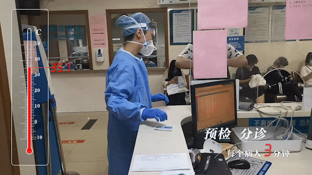 发热门诊里,室内温度不到30℃,病人陆陆续续进出,护士询问、记录、测量……隔着口罩和面罩,他们的声音显得沉闷;跟着病人,他们的步伐有些着急。
