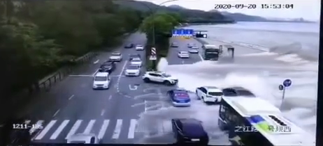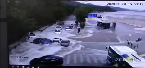 根据爆料人发来的视频可以清晰地看到:事情发生的地点在之江路一号坝西,车流正在平稳行驶着,突然,15时53分,潮水迅速地从江面向路面上扑过来,正在行驶的10多辆私家车、出租车被巨大冲击力的潮水一下子冲出了几米远,其中一辆私家车还压倒了路边护栏,两辆公交车被逼停了下来。私家车和公交车下半部都被浸泡在水里,公交车站和路边座椅也变成了水中车站。