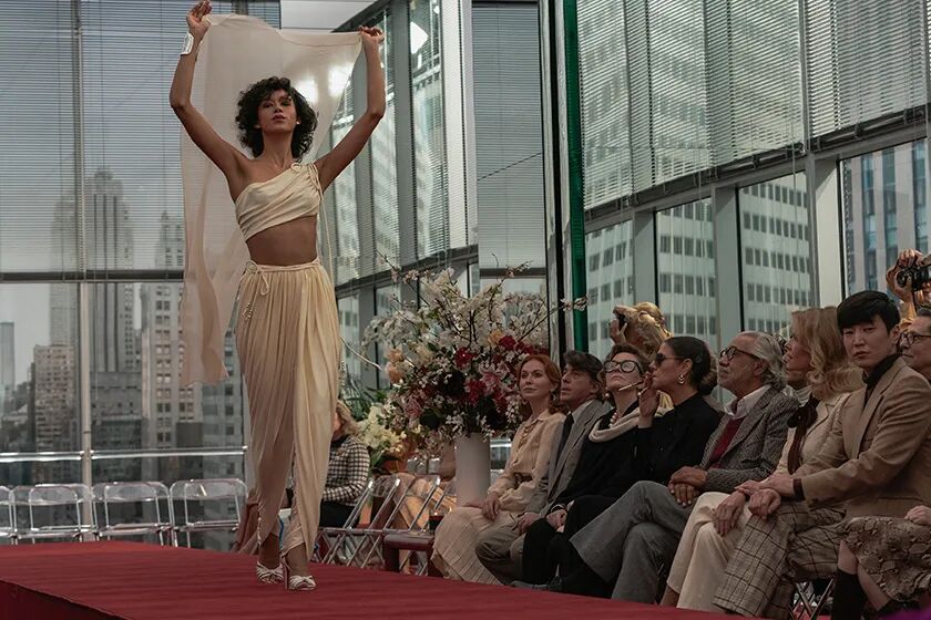 If I can get my designs on the one right person, I can get them on every woman in America.1961年,当车载广播里传来这样一段关于总统就职典礼的解说,“……Jacqueline Kennedy在就职典礼当天,戴着一顶小巧秀丽的Pillbox Hat,设计师是Roy Halston”。这位来自印第安纳州籍籍无名的男孩,几乎一夜之间声名鹊起。女人们蜂拥冲进Bergdorf Goodman百货,在侯斯顿女帽橱窗前排起长长的队伍。不到早上十点,杰奎琳同款药盒帽就已经被一抢而空。可惜好景不长,1968年的Jackie换上了更加新潮蓬松的发型后,帽子销量一路下滑,侯斯顿不得不稳中求变,改变设计重点。他把目光投到了彼时的时尚界新宠Ralph Lauren身上,决心借鉴思路,从一条领带开始,逐渐建立自己的成衣品牌。1968年,侯斯顿在纽约上东区租下一栋独立建筑作为工作沙龙,里面有供大众参观的Showroom,有设计团队的工作区域,还有专门招待VIP名媛们的专属休息间。他还迅速完成了早期核心团队的搭建(妥妥的全明星阵容):Elsa Peretti,时尚史上首位侯女郎。她有着迷人深邃的混血面孔,艳光四射又才华横溢。Rebecca Dayan 饰 Elsa Peretti她将侯斯顿的时装演绎到极致,还为他设计出了叫好又叫座的经典香水瓶身,后来成为蒂芙尼御用珠宝设计师。Joe Eula,著名时尚插画师,曾为Coco Chanel、Givenchy等多位时尚大师工作。如果说侯斯顿是团队中跳动的心脏,那他就是不可或缺的大脑,永远冷静而从容。Joel Shumacher,潜力无限的橱窗设计师。他的经历也实在传奇。后来被侯斯顿开除后,他误打误撞走上了影视道路,成为90年代赫赫有名的惊悚片导演。Rory Culkin 饰 Joel Schumacher