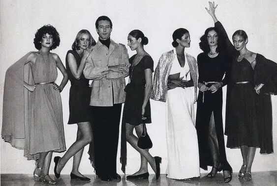 1978年,侯斯顿在与外交官哥哥的帮助下,携带他的时装设计访华交流,他们在北京和上海展示了丝绸如何融入西方时尚,还尝试着和中国丝绸厂合作。譬如他最出名的超麂皮衬衫裙,《纽约时报》就曾这么描述,“侯斯顿的衬衫裙是一个身份的安全毯,每一分钱都花的值得,而且你可以洗它。“再比如他首个成衣秀中的扎染连衣裙,宽大而飘逸,去结构化的剪裁让衣服回归原始属性,色彩炽烈而轻快,翩若蝴蝶,让穿上它的女人们散发着自然魅力。来自侯斯顿的经典设计不胜枚举,其中最出名的系列当然是1973年凡尔赛之战中的高定Collection。凡尔赛之战Battle of Versailles是美国时装设计师走向世界的第一步,亦是最受瞩目的一步,在此之前时尚界的话语权被法国人牢牢把控着。来自美国的五位设计师在凡尔赛宫对战五位法国设计师,这是至今从未有过的事。法国队派出了Yves Saint Laurent、Hubert de Givenchy……美国则请来了Oscar de la Renta、Stephen Burrows、Bill Blass、Anne Klein,还有我们的侯斯顿。这些美国的年轻设计师最终在凡尔赛一夜大放异彩,Anne的加勒比风情、Bill的盖茨比式绮丽梦幻,都让法国人为之震撼。“侯斯顿决意要让这场秀变得如梦境般美妙,每一件服装都是梦幻般的数字……”极富光泽感的面料、无处不在的羽毛织物、摇曳至地的亮片长裙,一切都被深深刻上了标记。Elsa还做了一把银色手柄的黑公鸡羽毛扇,拿它挡住前胸裸露的部分,复兴的华丽美感再现,既优雅又迷人。而经Norton Simon集团的商业收购,让他又一举成为最具商业价值的设计师。不过这次他的设计领域从成衣拓展到家居、箱包、香水,不同生产线齐头并发。Halston here,Halston there,Halston everywhere……以至于美国版《Esquire》曾出版文章,翻开就是醒目的大标题:从没有人质疑过侯斯顿的卓越才华,但这充斥泡沫的经济、无形伸展的商业触角、不可一世的自负与从未节制的挥霍,都为其日后天才悲剧式的覆灭埋下了种子……