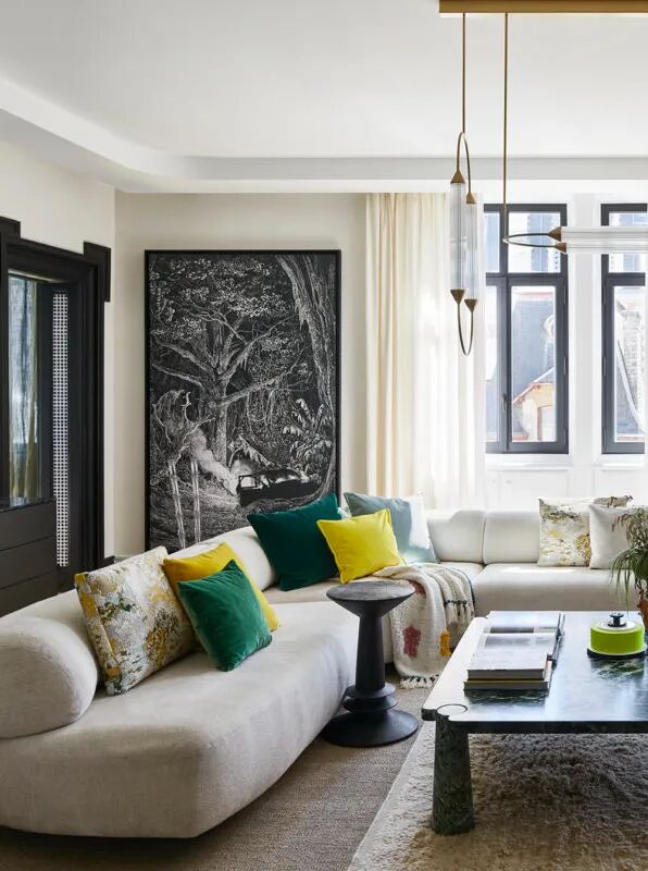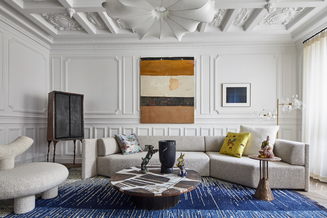 进入客厅入口的两侧放置了不同漆面的Pierre Casenove花瓶、Christophe Delcourt和天然柳条雕塑作品“ Medici”,这些前卫的家具及装饰品融入强烈的现代法式韵味,让人一踏入豪宅就能感受到极其强烈的Cartier个人设计风格。