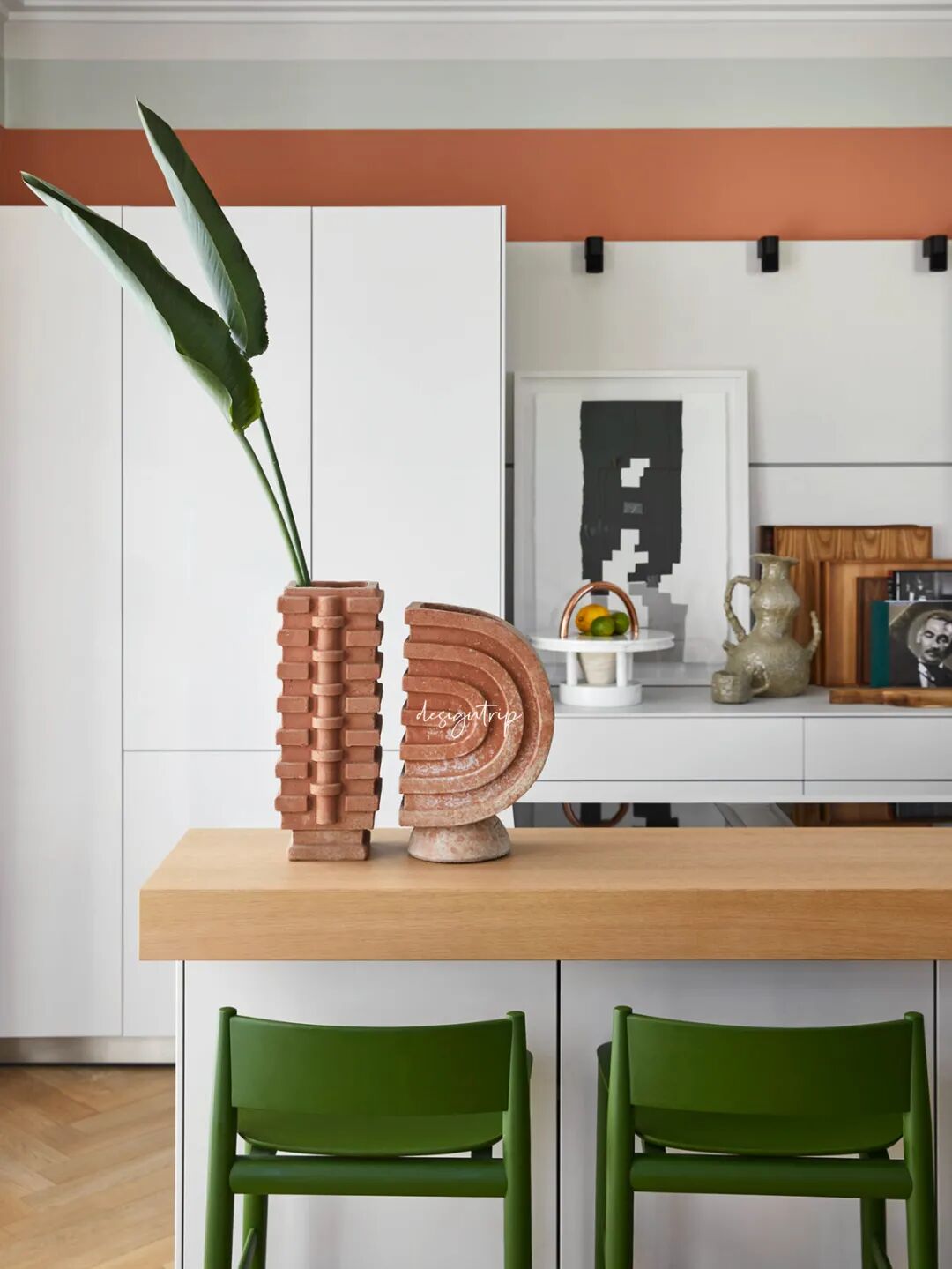 岛台的设计也是蜜总想一股脑全部搬回自己家的。原木色与绿色的搭配YYDS,岛台上红砖制成的异形花瓶和装饰品也有让人立刻想打开某宝开始图片搜索🔍的冲动。