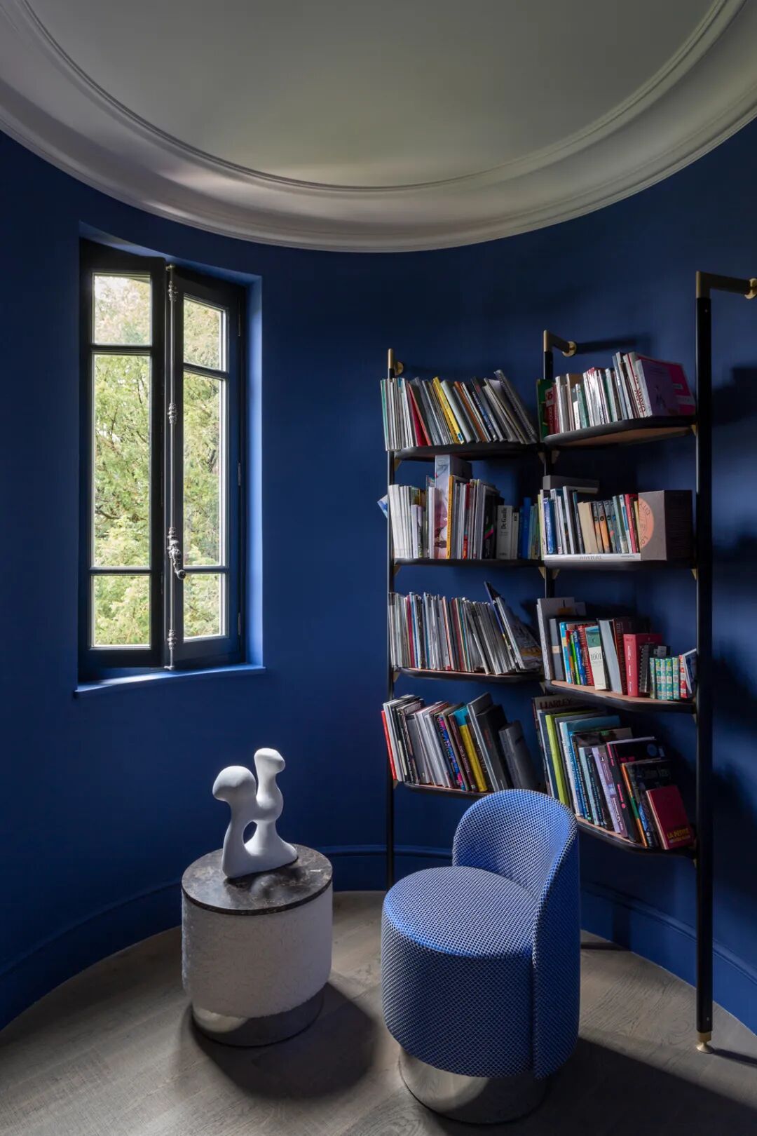 著名的法国家具设计师Christophe Delcourt还充分利用天花板的设计,专门设计了双重功能分隔书架,它就像巨大的屏幕一样,一侧满足了客厅中巨大EKO沙发的座椅功能,而另一侧则收藏着一系列杰出的陶瓷,实用性满分💯。