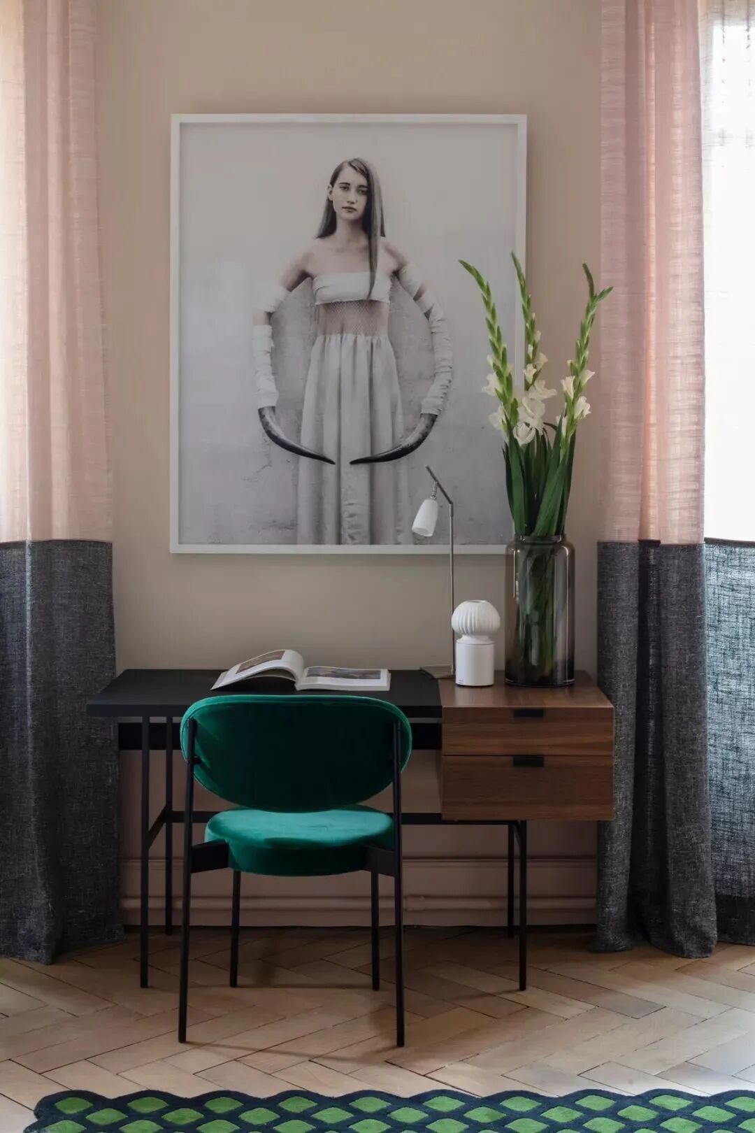 这套作品猛然看起来用色非常大胆,但色彩互相协调互相压制,所以看起来并不凌乱。奶油色和原木的搭配丰满有趣,成了这房子最大特点。