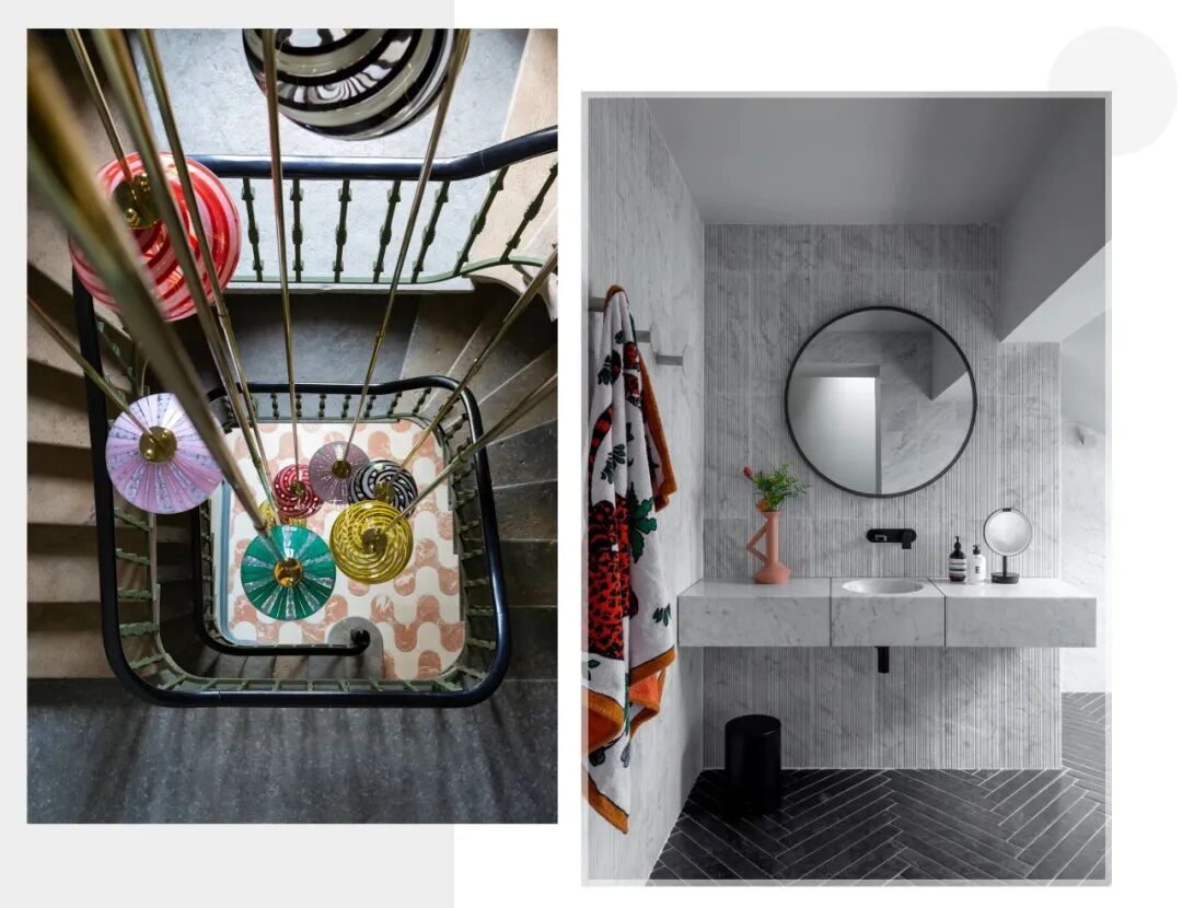 旋转楼梯的中间是色彩斑斓的吊灯,金属吊线与纹理与色彩皆不相同的灯罩起到锦上添花的点缀效果,对色彩的运用堪称完美,有很多小细节都值得我们细细品味。