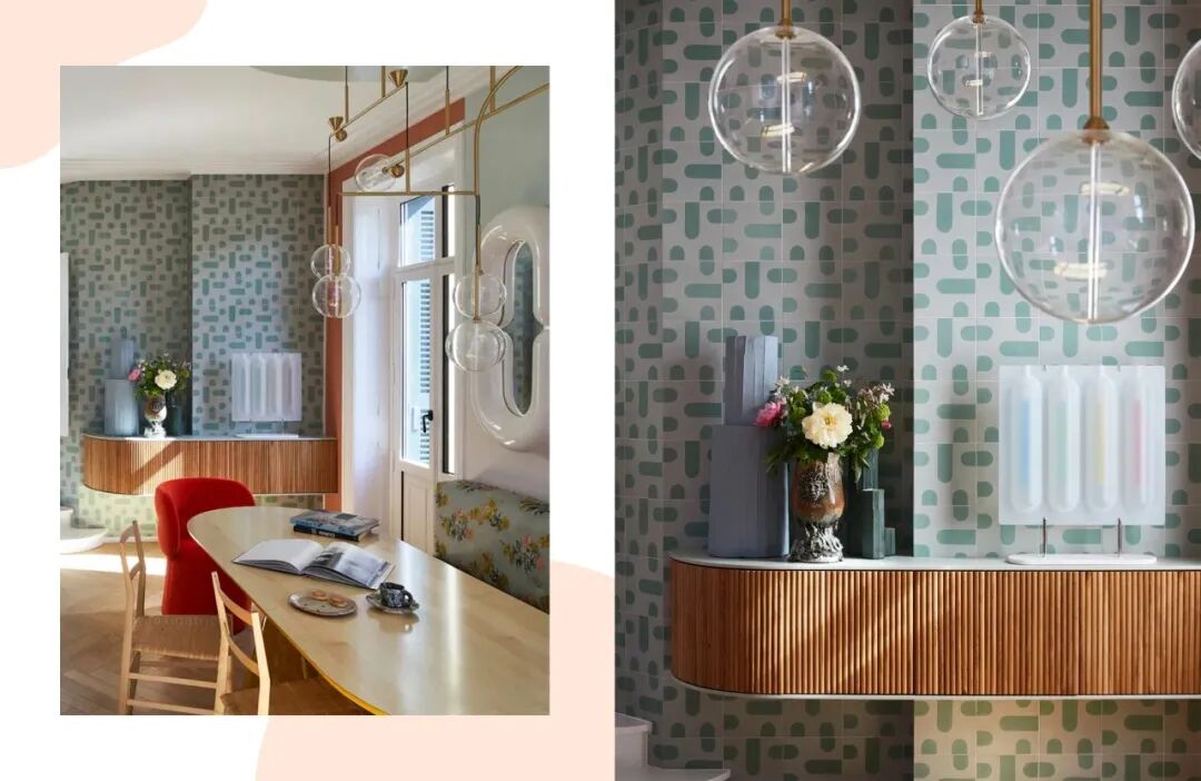 绿斑点瓷砖和拼接木条工艺的置台、清新淡雅的花朵一起形成一副美丽的复古油画,感觉下一秒女主角就会从拐角出现,原地拍摄一部标志性的法国文艺片~~