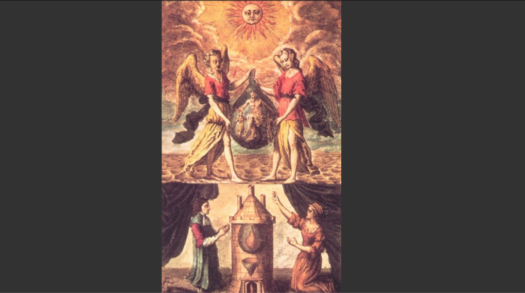 炼金术夫妻在物质世界中冶炼金属,而在天界,是天使把二人的灵魂放在瓶中冶炼