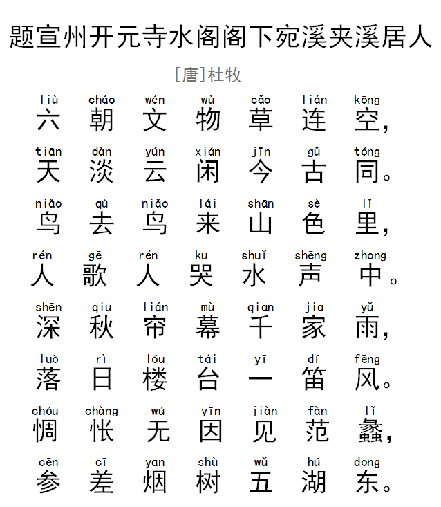 诗一开始写登临览景,勾起古今联想,造成一种笼罩全篇的气氛:六朝的繁华已成陈迹,放眼望去,只见草色连空,那天淡云闲的景象,倒是自古至今,未发生什么变化。这种感慨固然由登临引起,但联系诗人的经历看,还有更深刻的内在因素。诗人此次来宣州已经是第二回了。那种人世变易之感的心情渗透在三、四两句的景色描写中。接下去两句,展现了时间上并不连续却又每每使人难忘的景象:一是深秋时节的密雨,像给上千户人家挂上了层层的雨帘;一是落日时分,夕阳掩映着的楼台,在晚风中送出悠扬的笛声。两种景象:一阴一晴;一朦胧,一明丽。在现实中是难以同时出现的。但当诗人面对着开元寺水阁下这片天地时,这种虽非同时,然而却是属于同一地方获得的印象,汇集复合起来了,从而融合成一个对宣城、对宛溪的综合而长久性的印象。