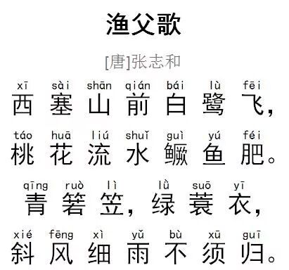 渔歌子:词牌名。此调原为唐教坊名曲。分单调、双调二体。单调二十七字,平韵,以张氏此调最为著名。双调,五十字,仄韵。