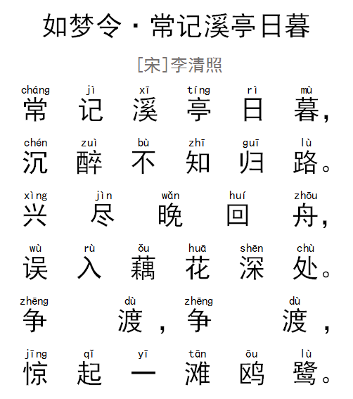 “常记”两句起笔平淡,自然和谐,把读者自然而然地引到了她所创造的词境 。“常记”明确表示追述,地点在“溪亭 ”,时间是“日暮 ”,作者饮宴以后 ,已经醉得连回去的路径都辨识不出了。“沉醉”二字却露了作者心底的欢愉 ,“不知归路”也曲折传出作者流连忘返的情致,看起来,这是一次给作者留下了深刻印象的十分愉快的游赏。
