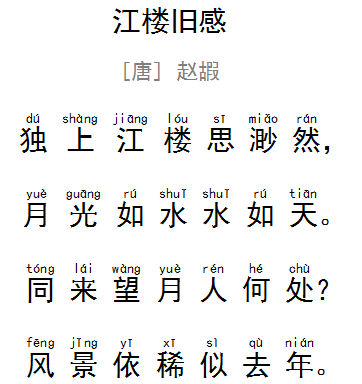 我独自登上江楼不由得思绪万千,眼前月光皎皎如水流淌,江水澄莹如天。曾经与我一同来此赏景观月的人现在在哪里呀?这儿的风景一如去年,没有变化。