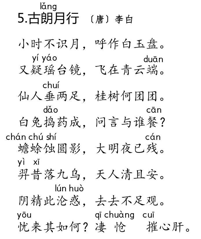 李白有《古朗月行》,鲍照有《朗月行》,写佳人对月弦歌。李白采用这个题目,故称《古朗月行》,但没有因袭旧的内容。诗人运用浪漫主义的创作方法,通过丰富的想象,神话传说的巧妙加工,以及强烈的抒情,构成瑰丽神奇而含意深蕴的艺术形象。诗中先写儿童时期对月亮稚气的认识:“小时不识月,呼作白玉盘。又疑瑶台镜,飞在青云端。”以“白玉盘”、“瑶台镜”作比喻,生动地表现出月亮的形状和月光的皎洁可爱,使人感到非常新颖有趣。“呼”、“疑”这两个动词,传达出儿童的天真烂漫之态。这四句诗,看似信手写来,却是情采俱佳。然后,又写月亮的升起:“仙人垂两足,桂树何团团?白兔捣药成,问言与谁餐?”古代神话说,月中有仙人、桂树、白兔。当月亮初升的时候,先看见仙人的两只脚,而后逐渐看见仙人和桂树的全形,看见一轮圆月,看见月中白兔在捣药。诗人运用这一神话传说,写出了月亮初生时逐渐明朗和宛若仙境般的景致。