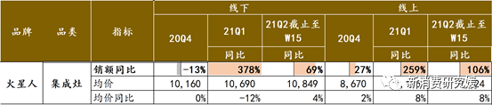 公司Q1实现营业收入3.5亿元,同比+179.8%,相对19年复合增速为40%左右,一方面,去年一季度受疫情影响基数较低,同时受益于地产竣工回暖,集成灶渗透提升,公司销售表现优异,且增速领先行业。根据奥维云网,21Q1销额、销量分别同比+163.3%、+144.6%,相对2019年复合增速分别为27.5%、27.0%,火星人增速明显高于行业。