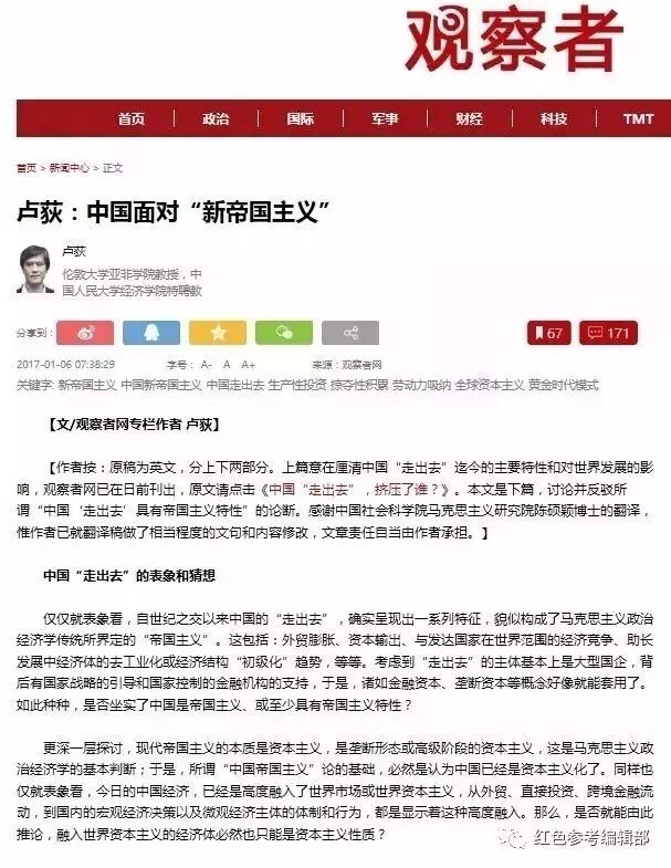 在此或许需要顺带说明一下,《红色参考》刊发我那篇文章,严格而言其实并没有得到我的授权,只是误以为我将文章上载“新中国”微信群组供有兴趣者讨论就是授权了。当然,文章已经存在于公共空间,这个误会也就不要紧,另外我对《红色参考》没有任何负面印象。这里只是想说明我对它毫无认识、跟它毫无联系,在写文章的时候也就无法顾及它的读者群体是否有恰当的知识-政治立场来解读我的立论。