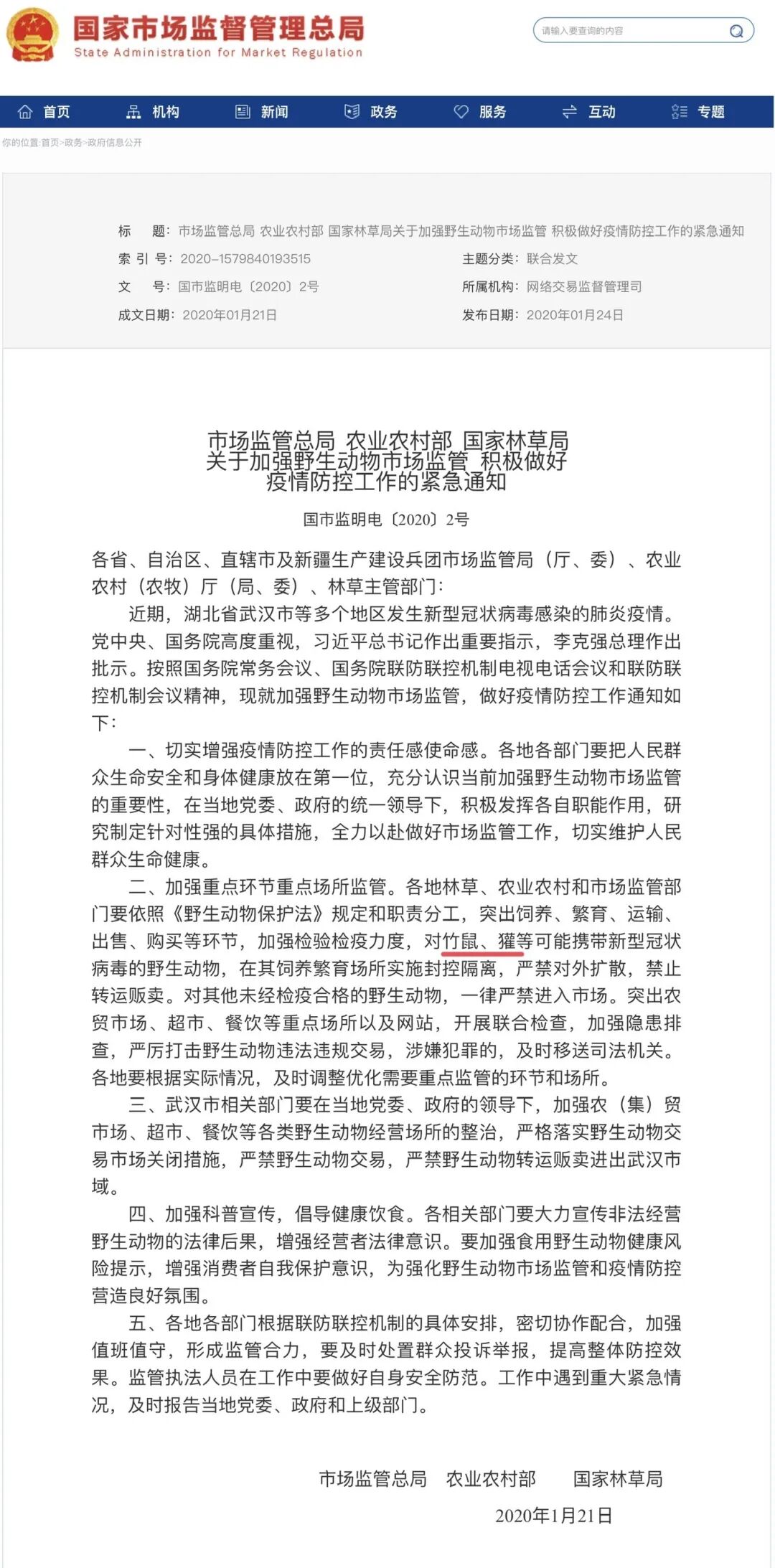 ▲1月20日晚,钟南山院士在接受央视采访时指出,此次新型冠状病毒很大可能来自于如竹鼠、獾之类的野生动物。次日,市场监管局、农业农村部和国家林草局联合下发关于野生动物交易,特别是禁止竹鼠和獾买卖的紧急通知。