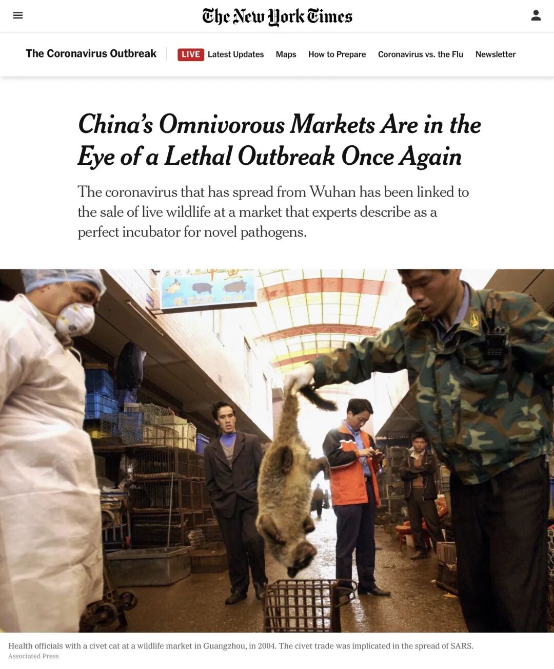 ▲1月25日,《纽约时报》驻北京记者Steven Lee Myers撰文《中国的杂食市场再次处于致命危机爆发的中心》。