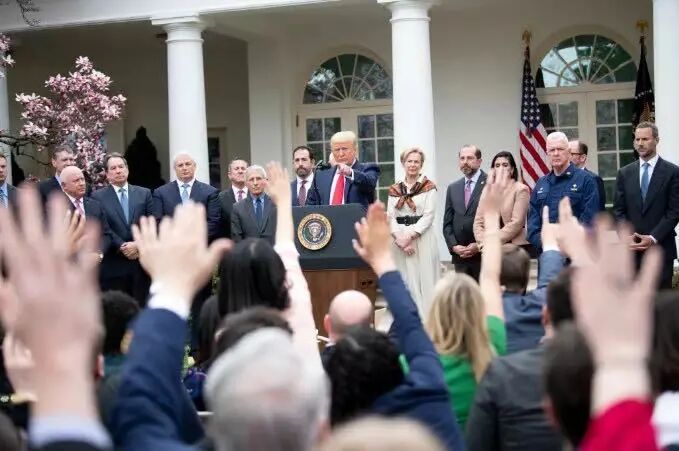 3月12日,世界卫生组织宣布新冠肺炎疫情“具有全球大流行病特征”的消息传入美国,这成了疫情与舆情的拐点。特朗普于翌日宣布全国进入紧急状态(类似的举措自1960年代以来,仅克林顿时期在纽约和新泽西宣布应对西尼罗河病毒的紧急情况这一例),并开放最多达500亿美元的资金渠道。随即股票市场应声大振,口罩也成功逆袭被推至舆论的风口浪尖。这一系列的反转似乎都在说明:全民抗疫的帷幕,在这里才刚刚被掀起。
