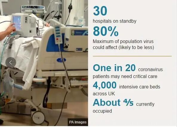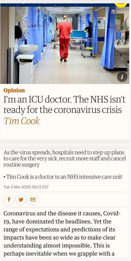 那么英国NHS真的像卫生大臣所说的那样“强大有效”么?3月3日,一名重症监护科的医生就在《卫报》上发文,明确表示,面对即将到来的新冠疫情,NHS完全没有准备好。按照现有统计估算,全英将会有30%-60%的人口感染新冠。其中,每7个病患中就可能有1名需要入院治疗。而在这些入院病人中,每5个患者中就可能会有1名是危重病人,需要重症监护设备辅助。