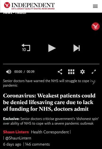 冠状病毒(Coronavirus):医生承认,由于NHS资金不足,最弱的病人可能被拒绝接受救生护理