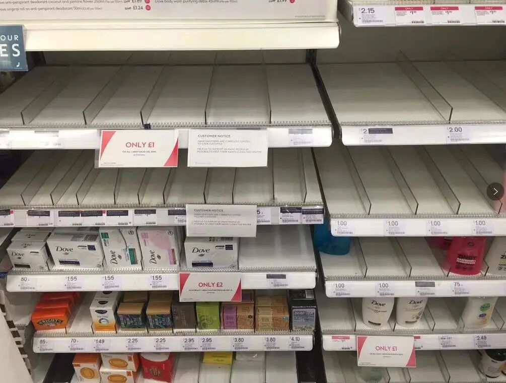 这就引出了为什么中国饱和防疫作业其他国家很难“抄”的第二个方面,即工业生产能力保障的缺乏。虽然英国没有像美国那样,明确表示自己国家库存口罩存在多大的缺口,但是按照现在英国市面上口罩难求的情况来看,英国就算是希望鼓励民众戴口罩,市场也供应不上。除了口罩荒之外,英国各大超市、网上购物网站上的免洗消毒洗手液从上周起便开始脱销。亚马逊与ebay上的免洗洗手液价格已经涨了5-10倍。至本周三,各大超市里的消毒纸巾、消毒液、洗手液等产品也开始出现脱销倾向,不少商家已开始对这类产品进行限购。许多大型超市里的卫生纸、洗手液、以及退烧药品货架也都已经开始出现断货情况。此外,卫生大臣3月5日才强调,已经与英国境内所有大超市领导人都开过会,确保疫情期间食物供应不会出问题。同时,超市还会为所有居家隔离治疗的患者提供送货上门的服务。结果,3月6日BBC的早新闻中,各大超市明确表示,从未跟卫生大臣有过任何此类接触。同时,以现有的递送能力,送货上门给居家隔离的患者更是毫无可能。当天晚上,英国的超市出现了抢购厕纸、意大利面、罐头等生活物资的狂潮。